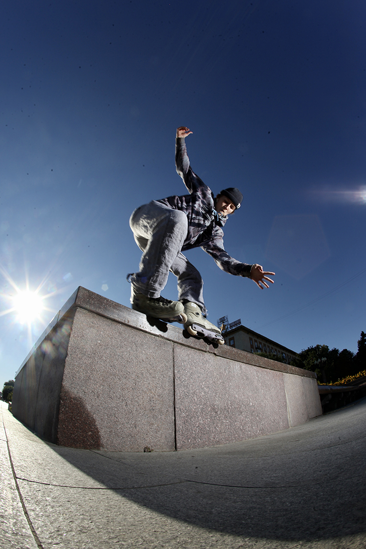 As luck would have it, we found a quiet courtyard with a graffiti piece saying “INLINEmade” by Inline the crew (a well known graf crew from Volgograd with a rollerblading background). Right in front of the courtyard, we found some interesting architecture worth investigating like this bank/ledge.